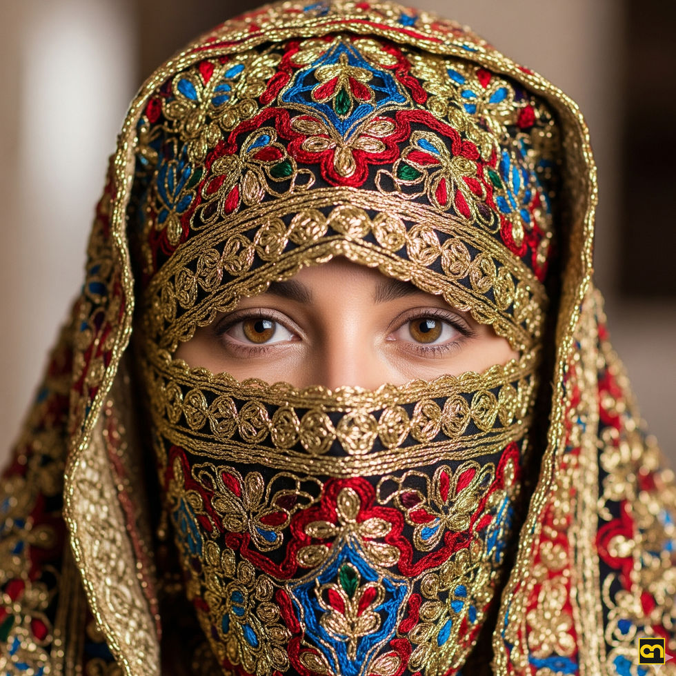 Sous un voile d'or et de velours brodé, le regard est l'unique point d'expression. Droit et serein, il force une connexion directe avec l'âme, transportant le spectateur à travers le silence de l'ornement.