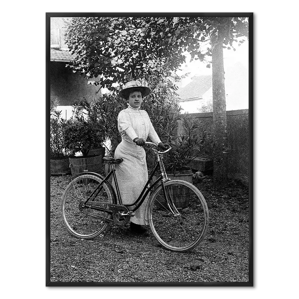 Une femme en chapeau et sa bicyclette (Val de Saône).